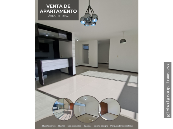 Se vende apartamento en Altos de Menga. Excelente vista. Apartamento de 118 mts2, consta de sala comedor, cocina integral abierta, amplio balcón con vista, 3 habitaciones, 3 baños, habitación principal con vestier, parqueadero paralelo. Conjunto cerrado con juego para niños, piscina, turco y jacuzzi, zona de BBQ.