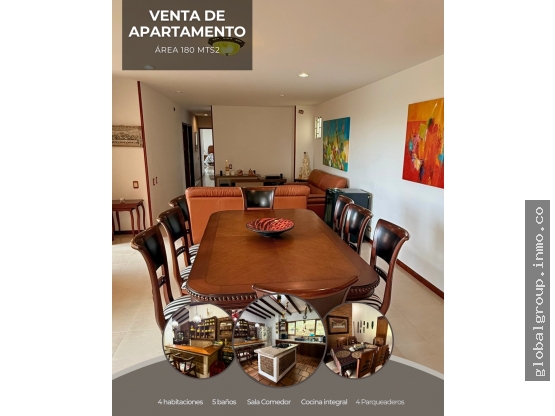 Se vende apto en Ciudad JArdín. 180 mts2 consta de sala, comedor, cocina integral, 4 habitaciones la prinicpal con baño, baño de habitaciones, baño social, aires acondicionados en las habitaciones. Zona de servicios, balcón, 4 parqueaderos 2 líneales y 2 paralelos.